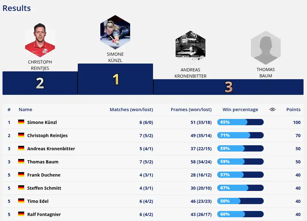 Den zweiten Platz belegte ihr Vereinskollege Christopher Reintjes (VfF Bad Kreuznach), der mit umsichtigem Spiel und großem Kampfgeist bis ins Endspiel vordringen konnte. Das Podium vervollständigten auf dem geteilten 3. Platz Andreas Kronenbitter und Thomas Baum, die beide mit sehenswerten Leistungen das Halbfinale erreichten.